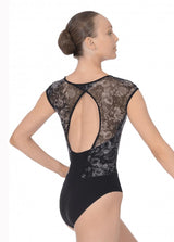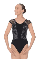 Featuring an open back and delicate floral mesh overlay, this cap-sleeved leotard is a sophisticated look for class and performances.