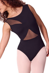 The Asymmetrical Boot Neck Leotard is the perfect fusion of jazz style and classic ballet. Featuring a sleek boat neckline and a unique asymmetrical mesh detail on the front, this tank leotard adds a touch of sophistication to your dance wardrobe.