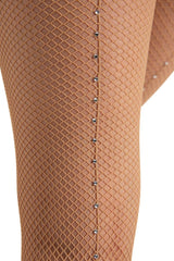 Crafted with a durable nylon and spandex blend, these footed fishnet tights embrace your form, while the back seam glimmers with sparkling rhinestones.