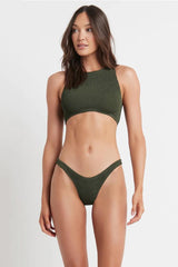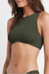 With a high neck and racer back, this crop bikini top offers a bold athletic look that can be worn as apparel, active, or swim wear.