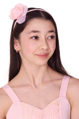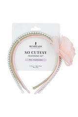 - 3 piece headband set consisting of one pink with rose headband, one white pearl headband, one gold glitter headband