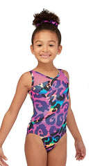 A bold pattern and mesh tank straps makes for a stylish gymnastics leotard to use for class or competitions.