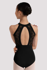 For an elegant design that moves with the body, this leotard features a sophisticated high neck and an open keyhole back with soft mesh panels adorned with floral embroidered details.