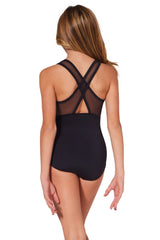 This tank leotard is a charming blend of elegance and functionality with mesh panels and criss-cross straps at the back that add a stylish touch while providing support.