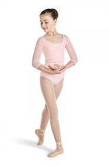 A mock wrap top with polka dot mesh to show off your dancer’s fun and sweet personality.