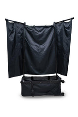 - To set up your Privacy curtain – attach your two side rods to your bag, replace your hanging rack top bar with the new privacy curtain top bar on the rack, extend the arms, and hang the curtain.