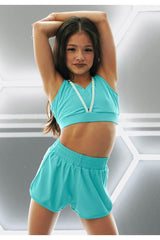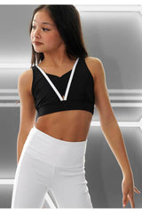 With a two-toned design and open back strap detail, this crop top adds a sporty style to your studio look.