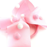 Adorned with mini pom poms, this large jersey bow hair clip is the cutest accessory for the stage.