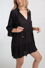 With a tiered, flowy skirt and beaded tie details, show off your bohemian beach style with this versatile and flirty tunic mini dress.