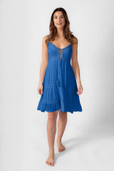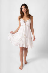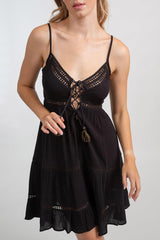 With a tiered design and lace up bodice, this intricate mini dress is sure to make a lasting impression.