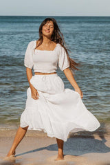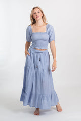 A must-have for your vacation wardrobe, this smocked crop top is perfect for beach-side dinners or day-time exploring.
