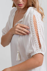 This lightweight tunic dress makes a statement on the beach or by the pool with its gathered sides and tassel ties.