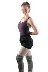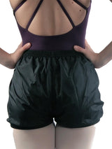 With an elastic waistband and leg bands to keep them in place, these lightweight shorts are a great wardrobe option for warm ups, classes, and rehearsals.